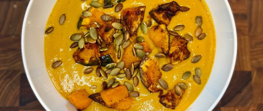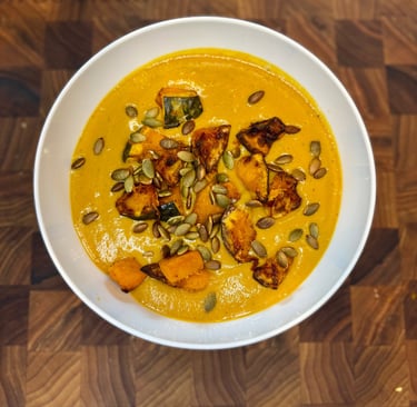 Garnish and serve: Ladle soup into bowls. Top with the air fried kabocha squash and a sprinkle toasted pepitas